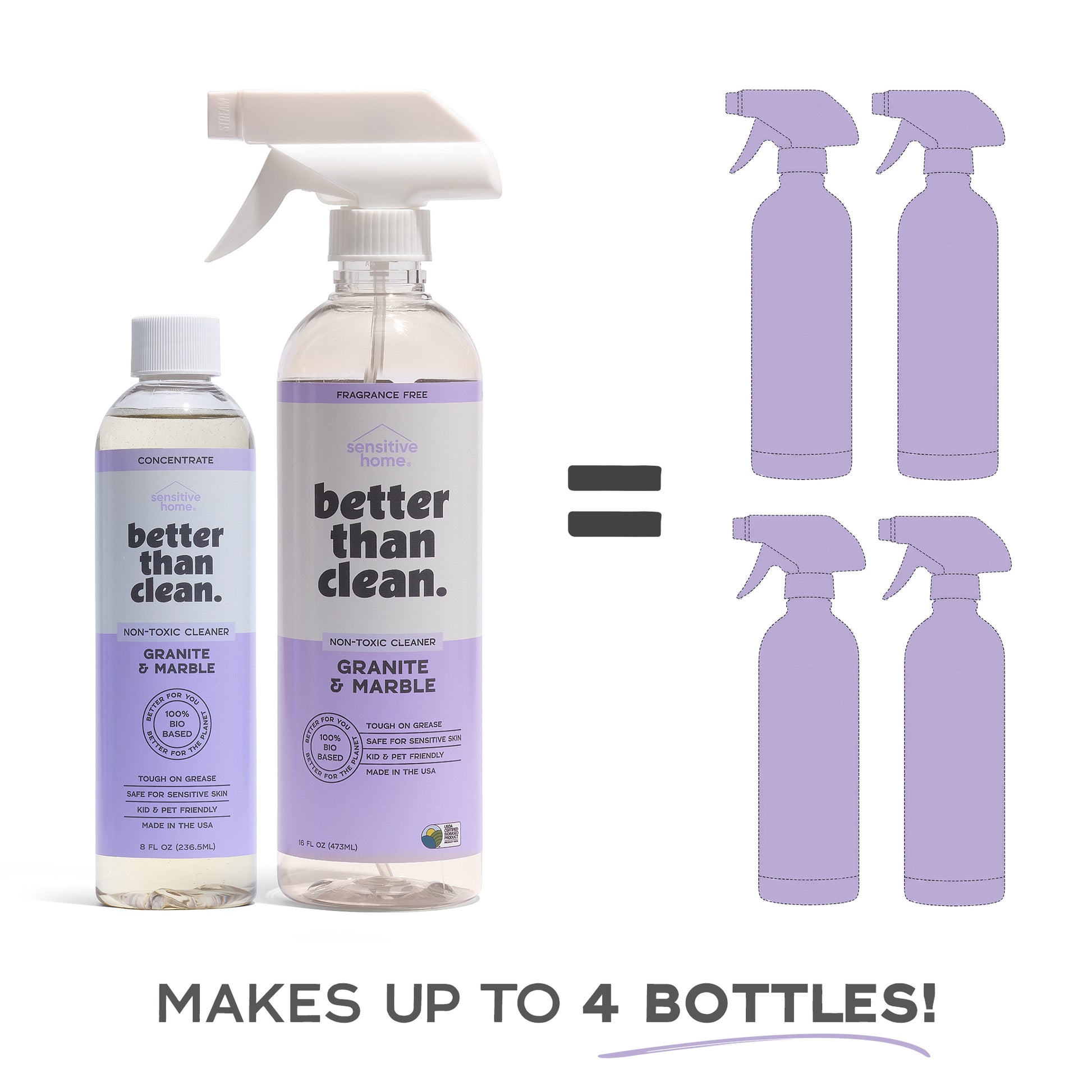 Our gentle yet effective, 100% plant-based FRAGRANCE FREE MARBLE AND GRANITE CLEANER treats your stone surfaces with the care and respect they deserve, leaving behind no known irritants, toxic residues or harmful emissions.